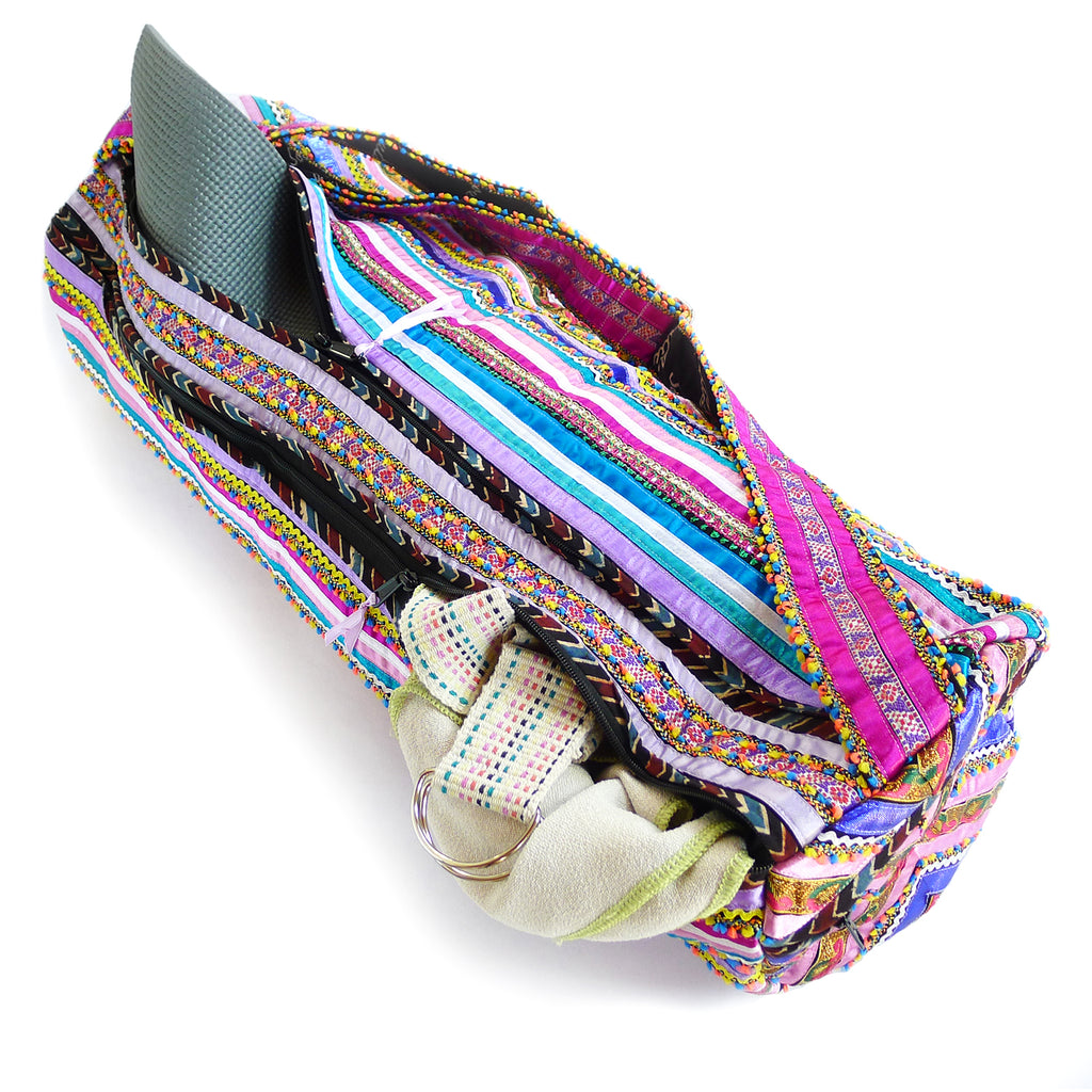 Our most beautiful artisan made yoga bag, designed to fit your favorite oversized yoga mat including the Manduka Pro mat and LuLu Lemon's yoga mats. Multiple zipper pockets make them easy to use and big enough for all your gear. Plus every bag sold contributed to our Artisan Scholarship Fund, helping artisans receive valuable business and skills training.